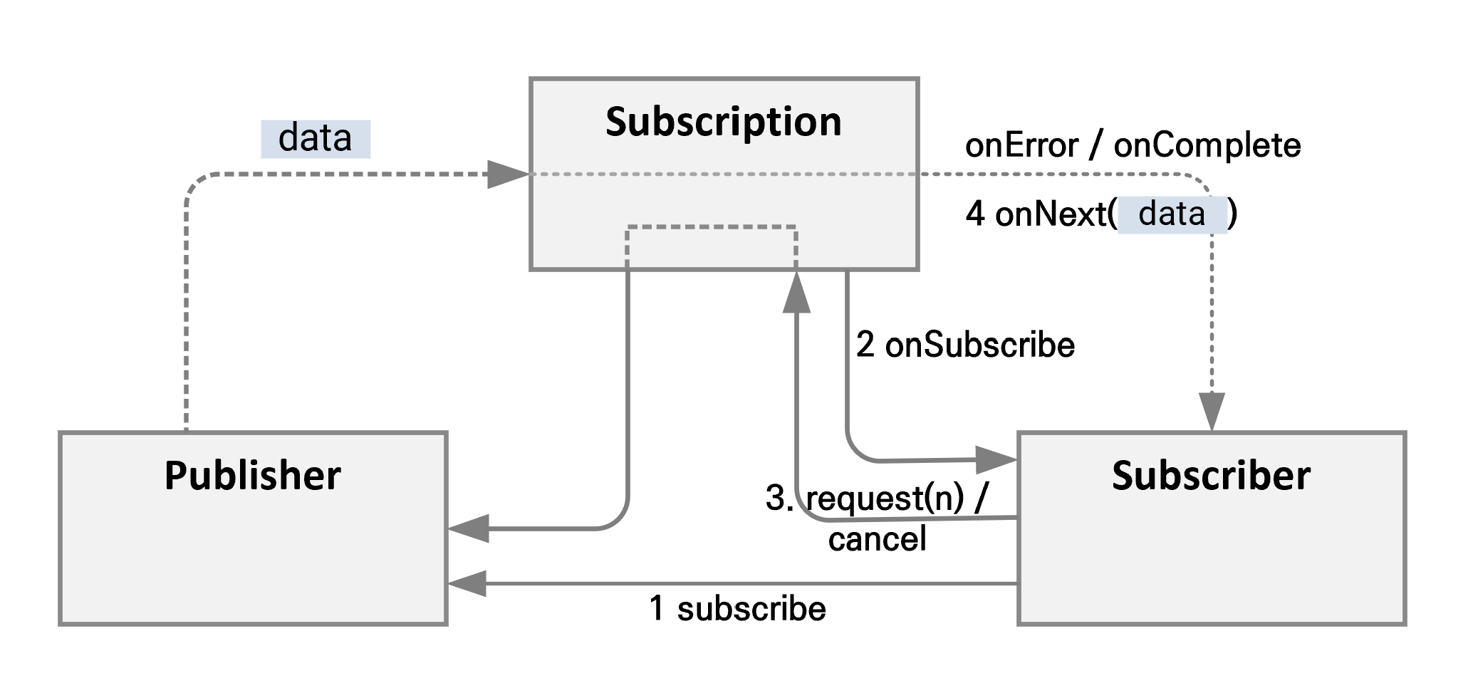 기본적으로 Subscriber는 subscribe()를 통해서 Publisher에게 구독을 요청합니다. 이후 Publisher는 onSubscribe()를 사용해 Subscriber에게 Subscription을 전달합니다.
