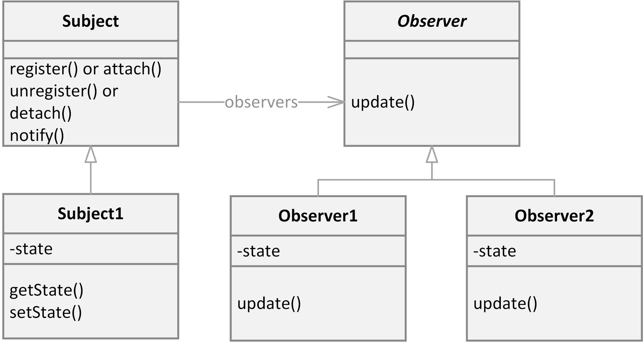 Observer 패턴은 객체의 상태 변화를 관찰하는 관찰자들인 Observer들의 목록을 객체에 등록하여 상태 변화가 있을 때마다 메서드 등을 통해 객체가 직접, 목록의 각 Observer들에게 통지하도록 하는 디자인 패턴 입니다. 발행/구독 모델로 알려져 있기도 합니다. 이벤트 처리 시스템이나 GUI 를 설계할 때 사용되는 패턴이기도 합니다.