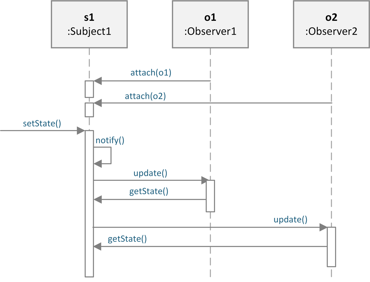 기본적으로 관찰자(Observer) 혹은 구독자(Subscriber)인 o1, o2는 관심주제(Subject) s1에 붙임(attach) 혹은 등록(register) 혹은 구독(subscribe)이라는 과정을 진행 합니다. 이 후에 관심주제 s1에 이벤트가 발생하면 통보(notify)하게 되고 관찰자들은 상태를 갱신(update) 할 수 있게 됩니다.