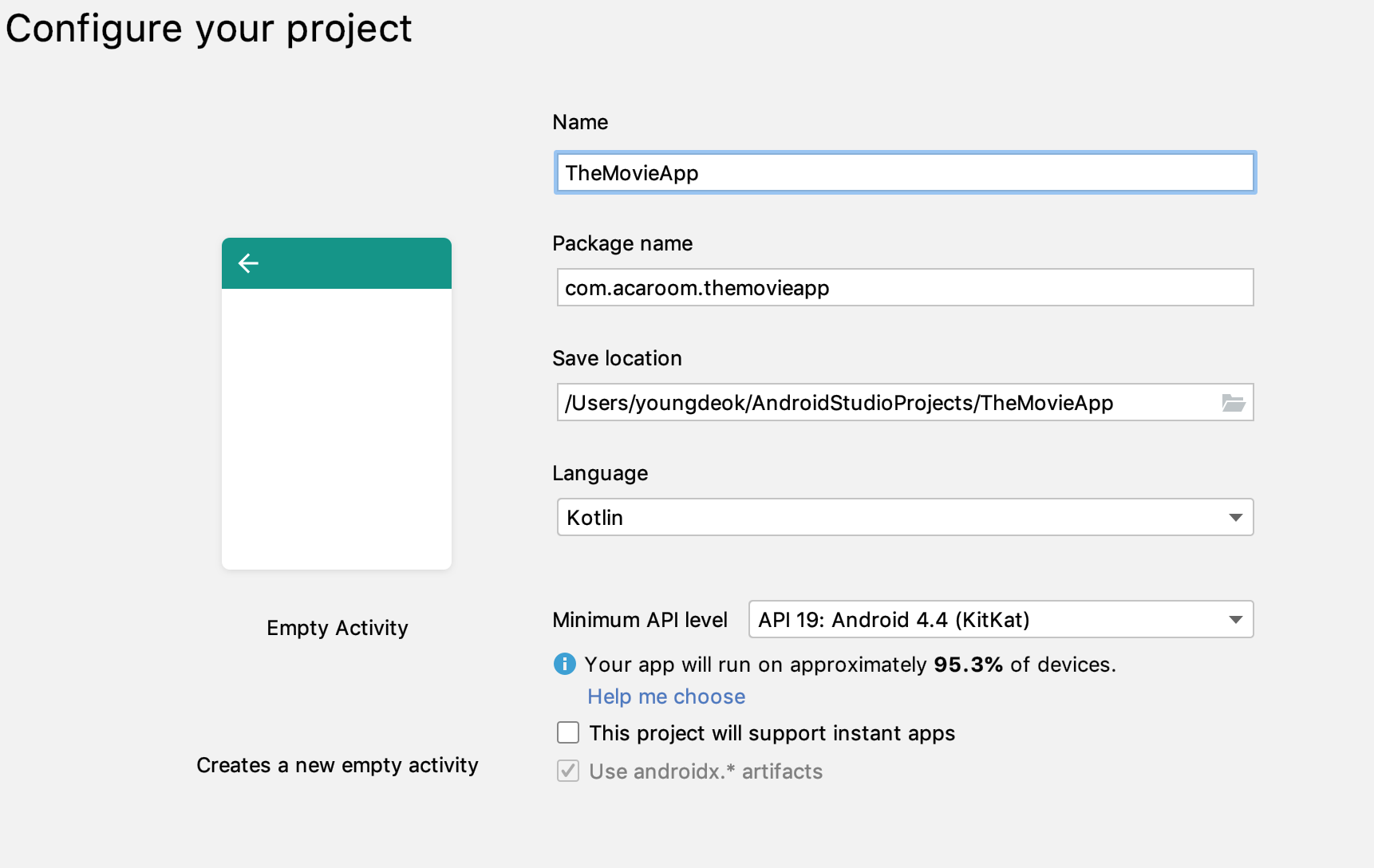3. Minimum API level은 업데이트되지 않은 안드로이드를 지원하기 위해 최소 API레벨을 지정할 수 있습니다. 글 작성 기준의 95.3%가 대략 사용되고 있는 API 19을 선택 하겠습니다. 이제 Finish 버튼을 누르고 새로운 프로젝트를 생성합니다.