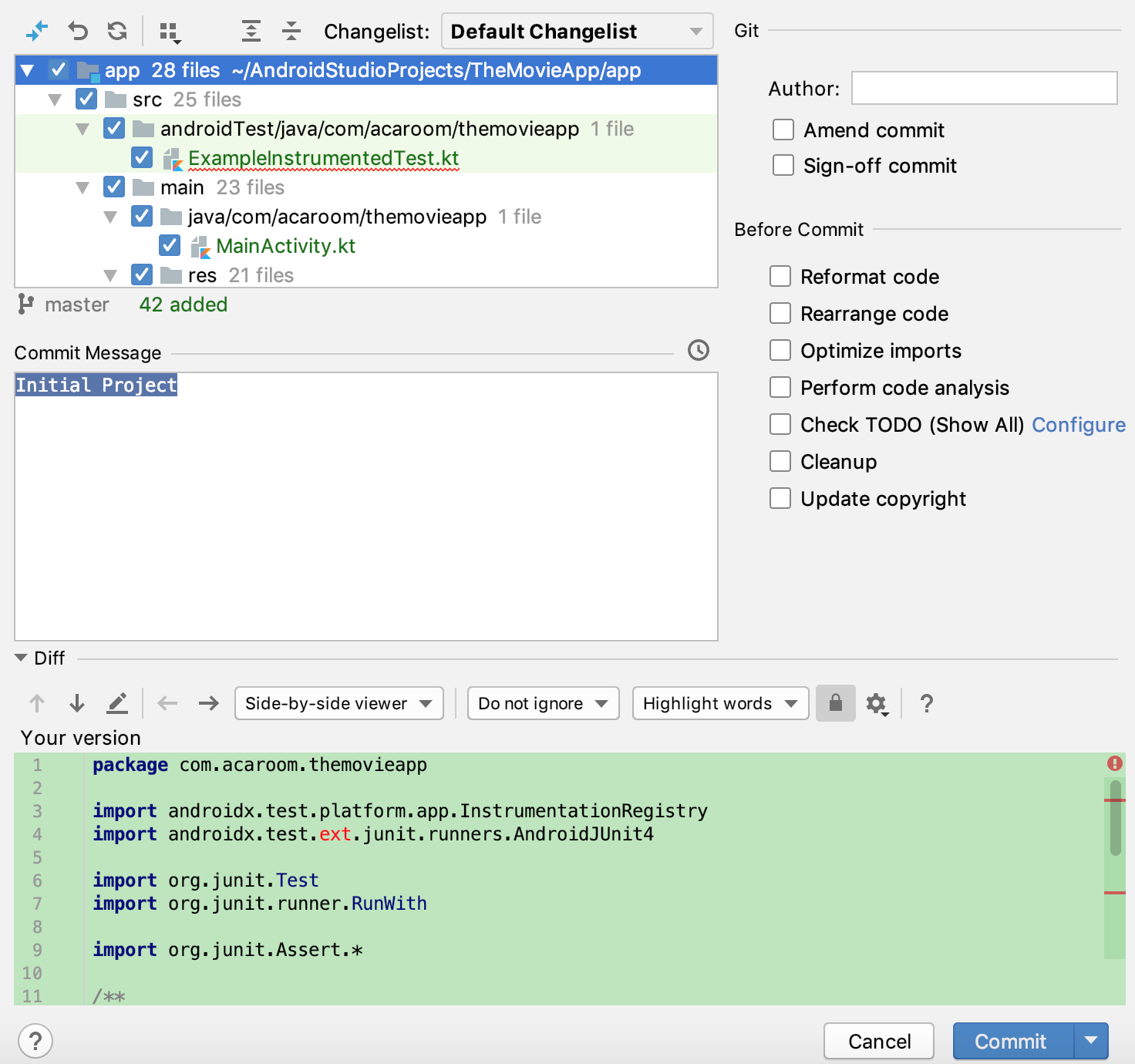 이제 저장소 설정이 끝났습니다. 지금까지 만든 내용을 커밋(commit)합니다. VCS > Commit...메뉴를 누르면 다음과 같은 화면이 나오는데 아직 프로젝트가 초기 상태이므로 Perform code analysis나 Check TODO 체크박스는 해제합니다.