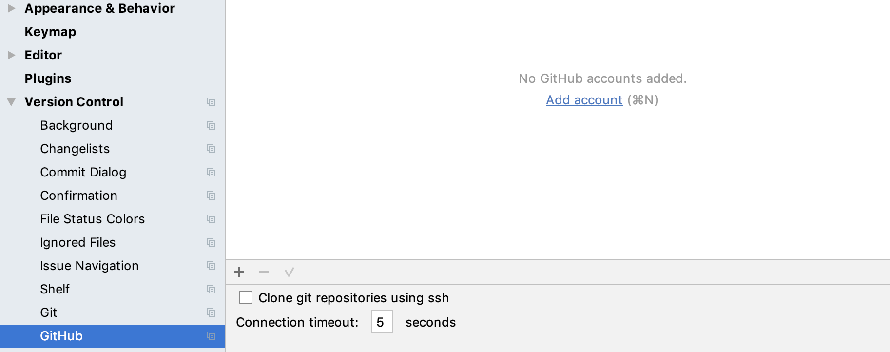 설정 메뉴의 Version Control > GitHub에서 Add account를 선택하고 자신의 계정 설정을 추가합니다. 물론 GitHub의 계정이 아직 없다면 만들어 주어야합니다.
