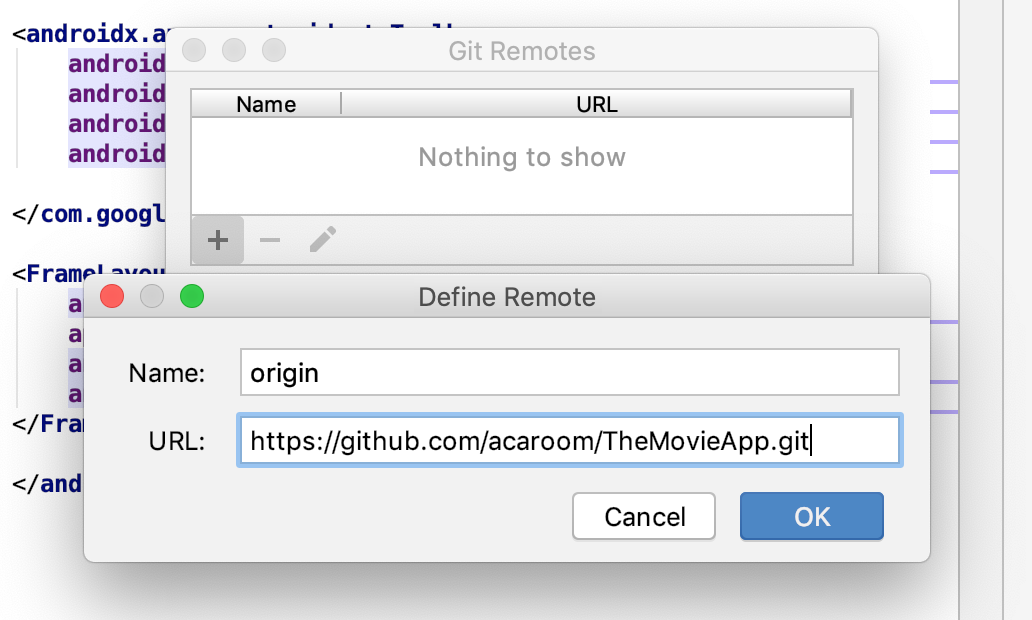 이제 Android Studio에 VCS > Git > Remotes...메뉴를 누르고 다음과 같이 복사한 원격 저장소 위치를 지정해 줍니다.