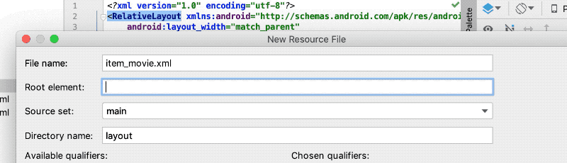 3. 이번에서 새로운 레이아웃 item_movie.xml을 위와 같은 방법으로 res/layout/에 추가합니다. 이번에는 상위 요소(Root element)로 CardView를 지정합니다.