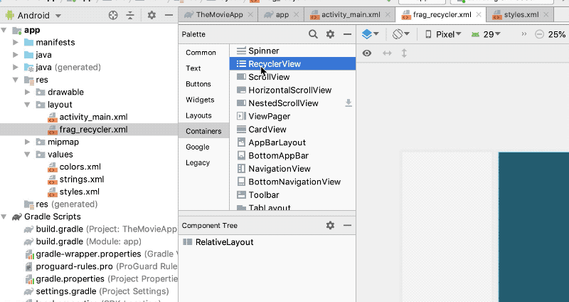 이제 만들어진 레이아웃에 다음과 같이 RecylerView를 드래그앤드롭으로 배치하거나 fag_recycler.xml에서 직접 코딩합니다.