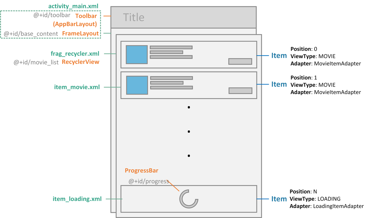 영화 정보는 item_movie.xml에서 이미지, 설명, 작성자, 추천수, 출시된 날짜 등을 위해 ImageView와 TextView를 활용해 배치하도록 합니다. RecyclerView를 위로 스크롤 하면 데이터의 제일 마지막은 ProgressBar를 가지는 로딩 아이템 뷰로 배치하도록 합니다. 새로운 뉴스 컨텐츠가 로드 되면 다시 뉴스 아이템으로 채워집니다.