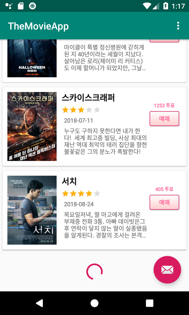 정보를 읽어오는데 문제는 없으나 최대 20개의 영화정보를 표현할 뿐 더 이상의 페이지가 나타나지 않습니다. 또한 각 아이템의 클릭 이벤트 처리도 빠져 있습니다. 또 다른 문제로 앱이 가로로 변경 되면 기존에 보던 데이터가 사라지고 화면이 다시 그려지며 데이터가 초기화 됩니다. 오리엔테이션에 대한 고려가 필요합니다.