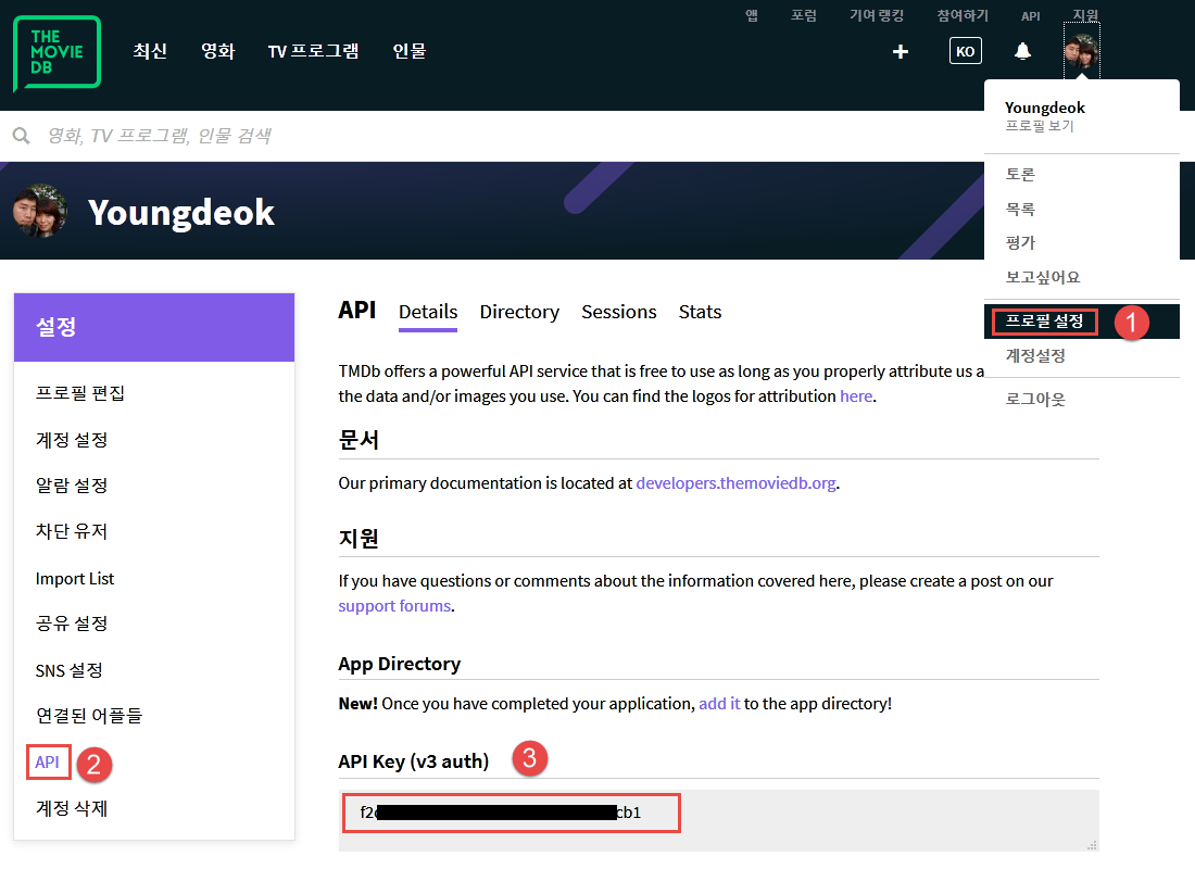 이런 사이트의 공개된 데이터들을 이용해 자신만의 서비스로 다시 설계할 수 있을 것입니다. 대부분의 사이트는 오픈 API를 이용하기전에 API 키를 받아서 인증해야 합니다. 한국 사이트의 경우 API 인증을 위해 공인 인증이나 전화 인증을 해야하는 경우가 많습니다. 우리 프로젝트는 영화 정보를 제공하기 위해 TMDB사이트를 이용할 것입니다.