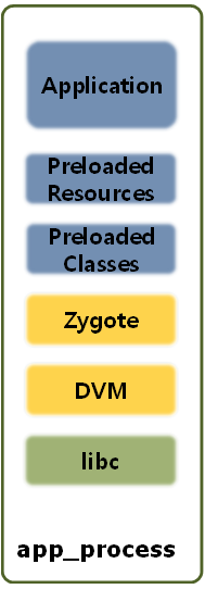안드로이드 앱이 사용하는 Heap은 DVM내에, 즉 가상머신 내부에 구성됩니다. JVM과 유사하게 DVM의 메모리가 구조화 되어 있으며 Heap을 GC가 관리하고 있습니다. 이렇게 Application 부분, 즉 머리에 해당하는 핵심 코드 부분은 제외한 나머지 부분이 Pool에 이미 구성되어 있어 실행할 때 그 부분만 교체됩니다.