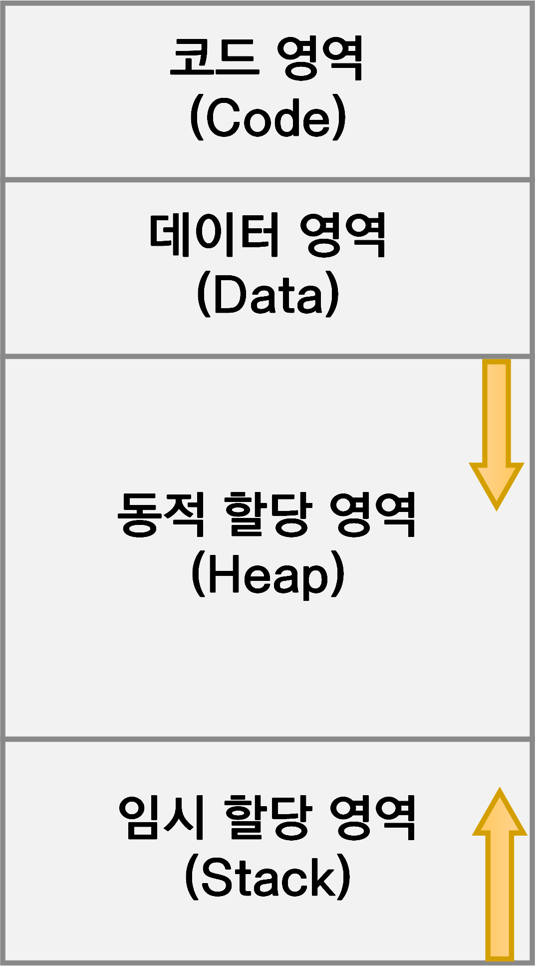 추가적으로 코드 블록인 중괄호({}) 안에 사용된 변수나 함수 호출 블록들은 임시로 쓰이는 메모리 영역인 스택(Stack)에 들어가며, 중괄호 블록이 끝나면 임시로 사용된 변수는 스택에서 제거가 됩니다.
