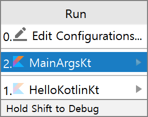 여기서 새롭게 작성한 MainArgsKt를 선택해 실행합니다. 실행 결과는 어떤가요?