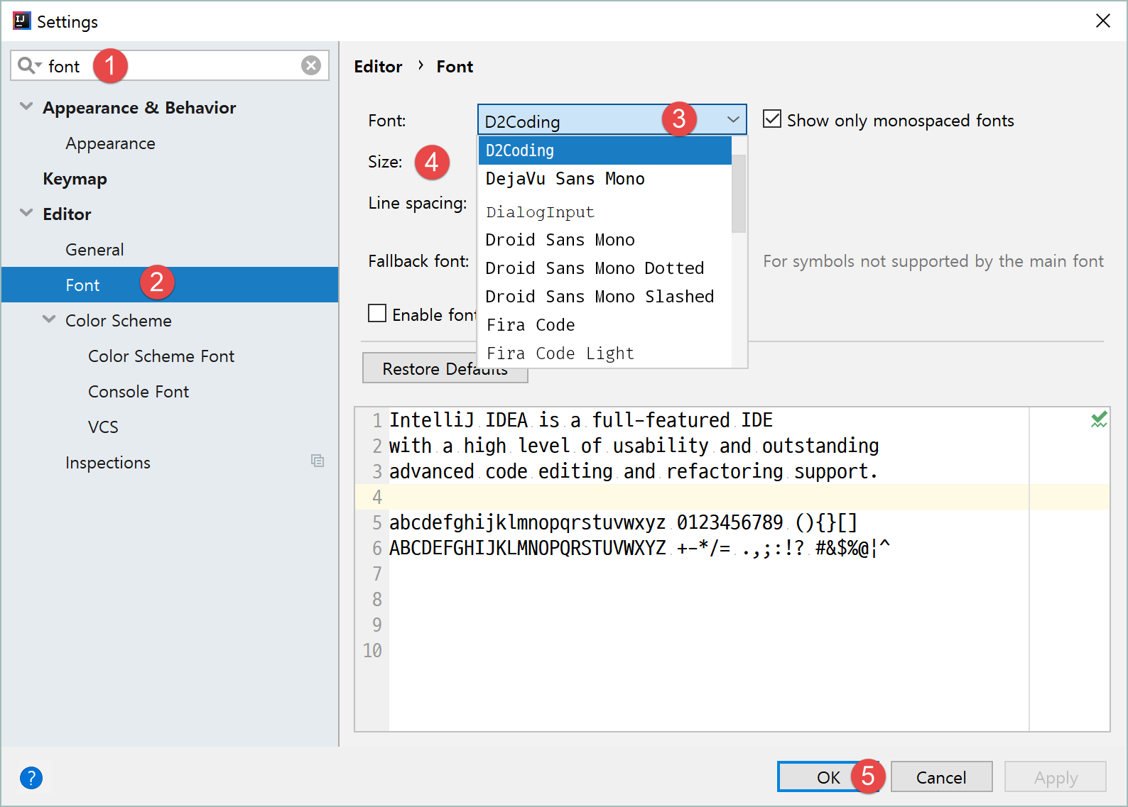 글꼴을 변경해 볼까요? 보통 개발자들은 쾌적한 코딩을 위해 적절한 글꼴을 선택하여 사용합니다. 이 책에서 사용하는 글꼴은 D2Coding입니다. D2Coding은 한글을 완벽하게 지원하여 가독성이 좋습니다. 다음 위치에서 내려받을 수 있습니다. 글꼴을 설치한 후에는 IntelliJ IDEA를 다시 시작합니다.