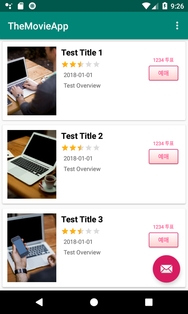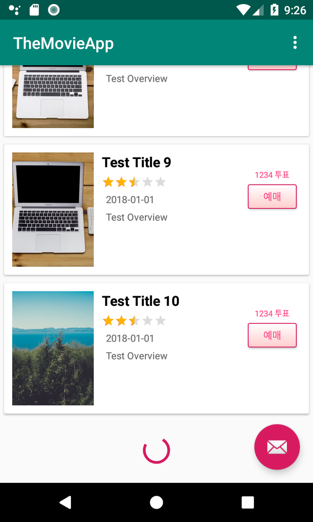 3. 이제 RecyclerView가 정상적으로 작동하는지 MovieFragment의 onActivityCreated()에 테스트용 데이터를 만들어서 실행해 보겠습니다.