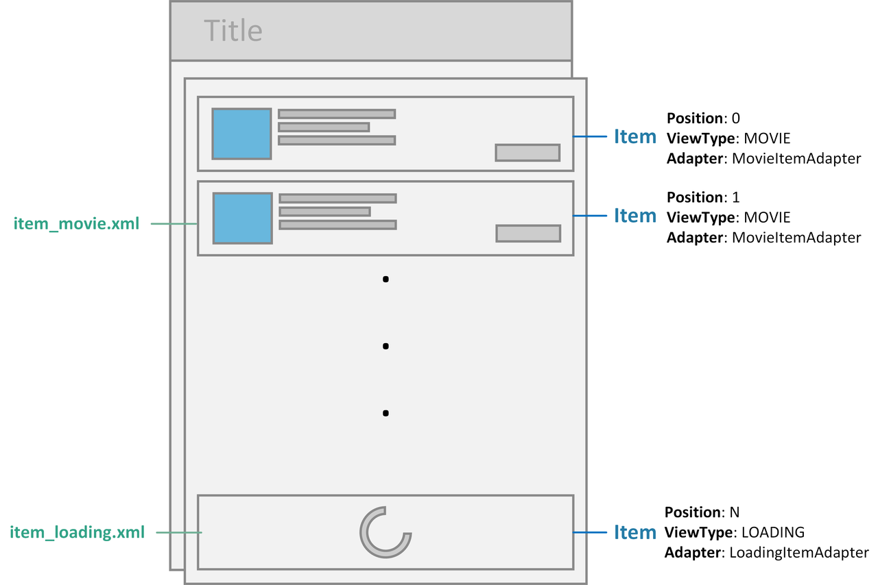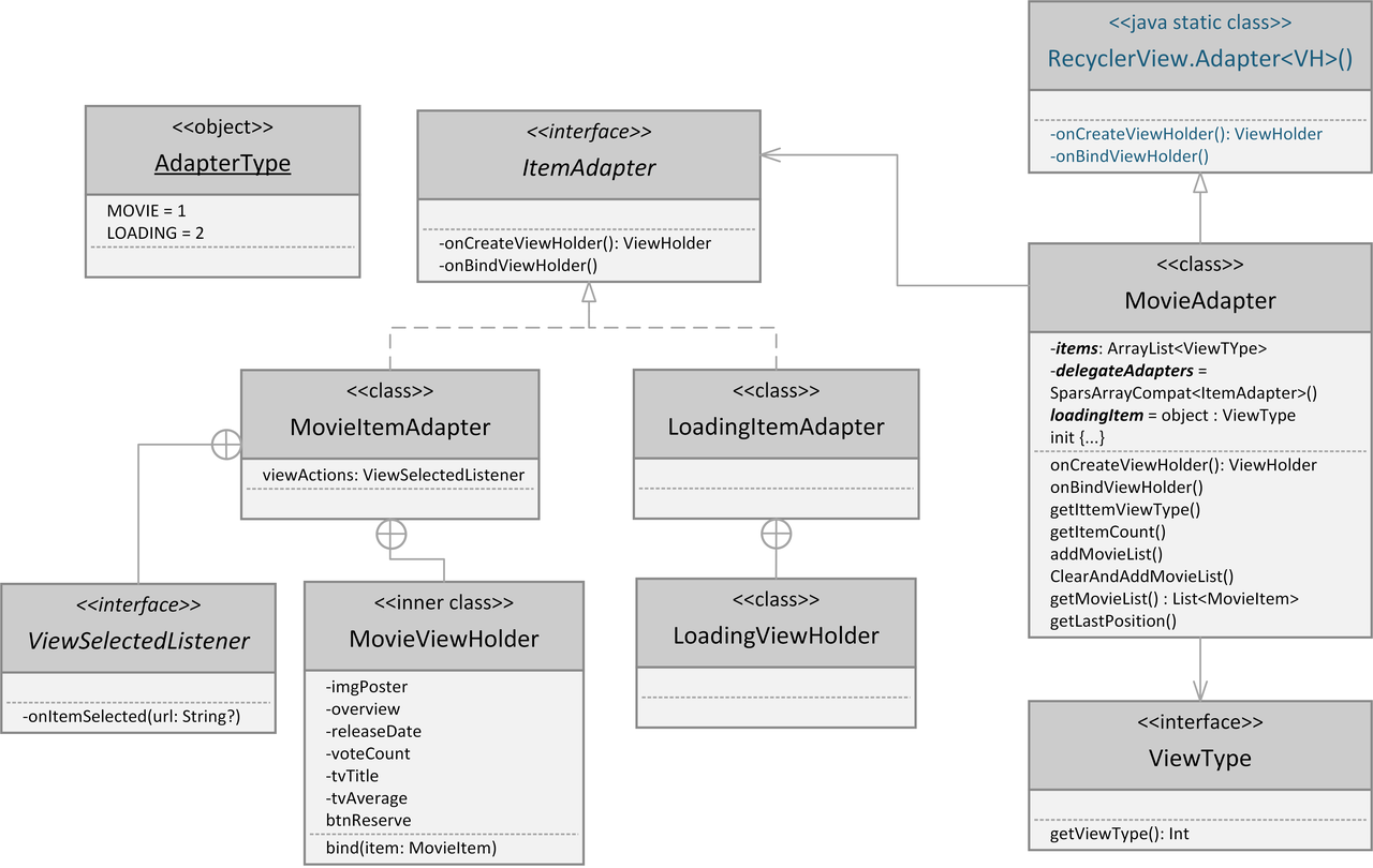 이번 단계에서는 영화목록을 불러들이기 위한 데이터 클래스와 어댑터를 생성할 것입니다. 영화 정보와 로딩 표시를 위해 RecylerView에 특정 뷰를 반환 하거나 나타내는 위임된 어댑터가 필요합니다. 이 어댑터에 영화 정보 표시 뷰와 로딩 중 표시를 위한 뷰 두개가 사용될 것입니다. 이 두개의 뷰를 선택할 수 있도록 ViewType을 두가지 종류를 정의합니다. 각 아이템은 인자로서 위임된 어댑터에 전달됩니다. 여기서 세부적인 데이터를 보여줄 수 있도록 합니다. 두개의 뷰를 보여줄 것이므로 어댑터도 두개 종류MovieItemAdapterLoadingItemAdapter 로 만들 예정입니다.