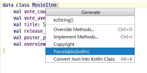 3. 그러면 MovieItem 클래스명 위에서 [Alt+Insert]를 누르고 코드를 생성할 수 있습니다.