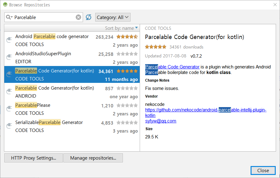 다만 구현해야하는 생성자, 프로퍼티, 메서드가 매번 같은 형태로 작성되기 때문에 보일러 플레이트 코드에 해당됩니다. 이것을 일일이 작성한다는 것은 지루한 작업이 될 수 있죠. 따라서, 이것을 에디터의 플러그인에서 제공하는 Parcelable 코드 생성기를 이용하면 해당 클래스에서 Parcelable에 필요한 코드를 자동적으로 생성시킬 수 있습니다. 그러면 플러그인을 이용해 봅시다.