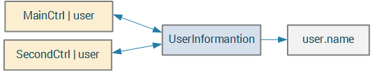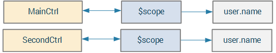 });위 처럼 두개의 분리된 컨트롤러에서 user.name을 다루려고 할때 안쪽에서 이름을 쓰면 다른쪽에서 똑같이 반영되도록 하고 싶을때 이코드는 제대로 동작하지 않는다. 왜냐면 스코프가 분리되어 있기 때문이다.